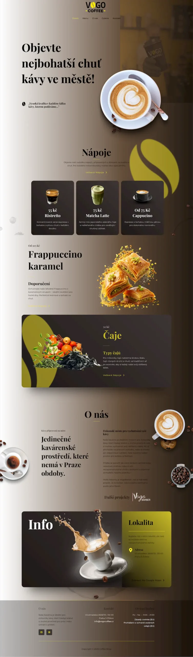Prezentace kavárny s nabídkou nápojů, informacemi o provozovně a kontaktem (Praha 3, Atrium Flora).